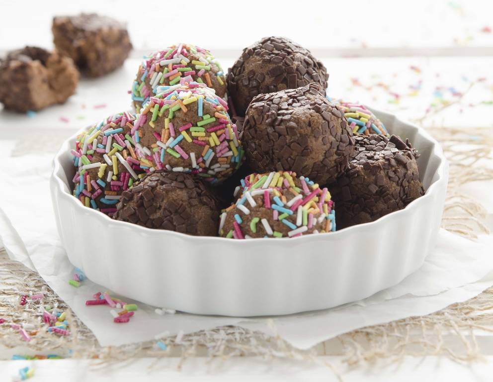 - Mit angefeuchteten Händen aus der Masse gleichgroße Kugeln formen und diese in Schokoladen- und Zuckerstreuseln wälzen.