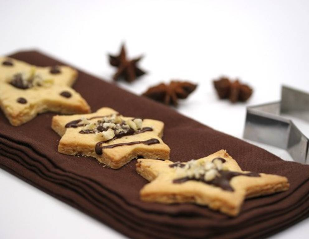 - Die ausgekühlten Sterne mit Schokolade und gehackten Haselnüssen verzieren.
