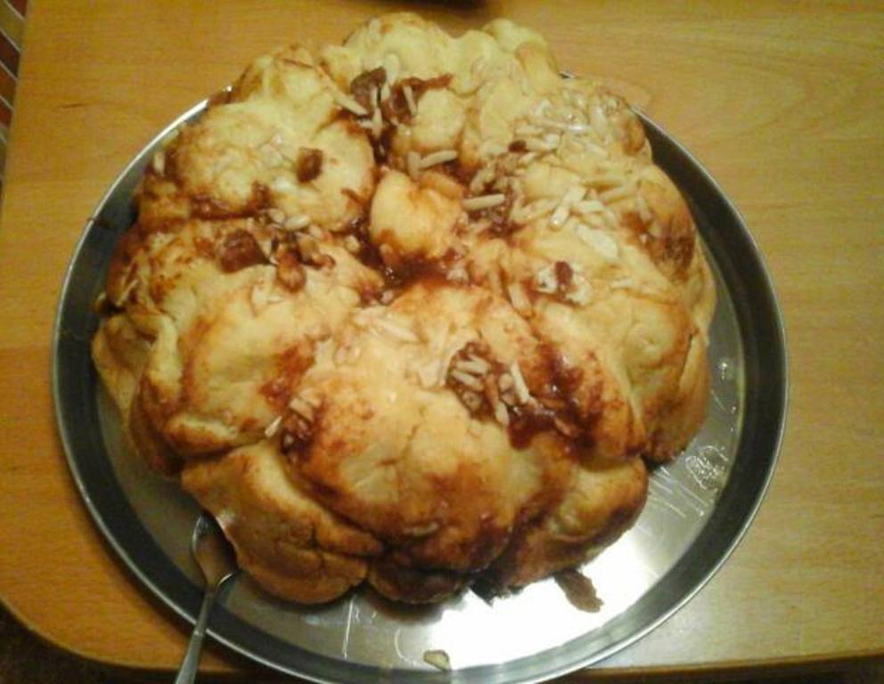 - Den Backofen auf 175°C vorheizen. Nun den Germteig in gleich große Stücke teilen. Jeweils ein Stück flach drücken, 1 Stückchen Toblerone und etwas Frischkäse hineinlegen und zu einer Kugel formen bzw. drehen. In die gefettete und mit Mandeln bestreute Form legen.
