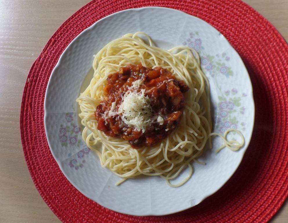 - Den Speck in einer Pfanne anrösten, Zwiebel und Pfefferoni dazugeben und dünsten. Tomatenmark untermengen und Knoblauch einrühren. Nun noch die gehackten Paradeiser dazugeben und eine knappe halbe Stunde bei mittlerer Hitze ohne Deckel garen.