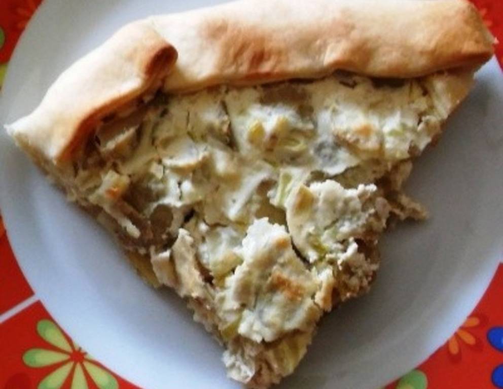 - Den Teig auswalken, eine Tarteform damit auslegen und mit der Artischockenmasse bestreichen. Den überstehenden Teig einklappen.