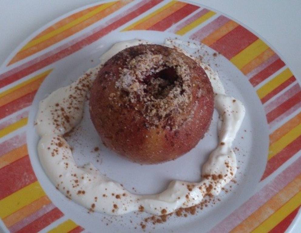 - Den Apfel in eine Auflaufform oder auf ein Backblech setzen. Den Apfel mit geschmolzener Butter anstreichen und mit Zimt und Zucker überstreuen. Den Apfel in den vorgeheizten Backofen bei 180°C eine halbe Stunde backen.