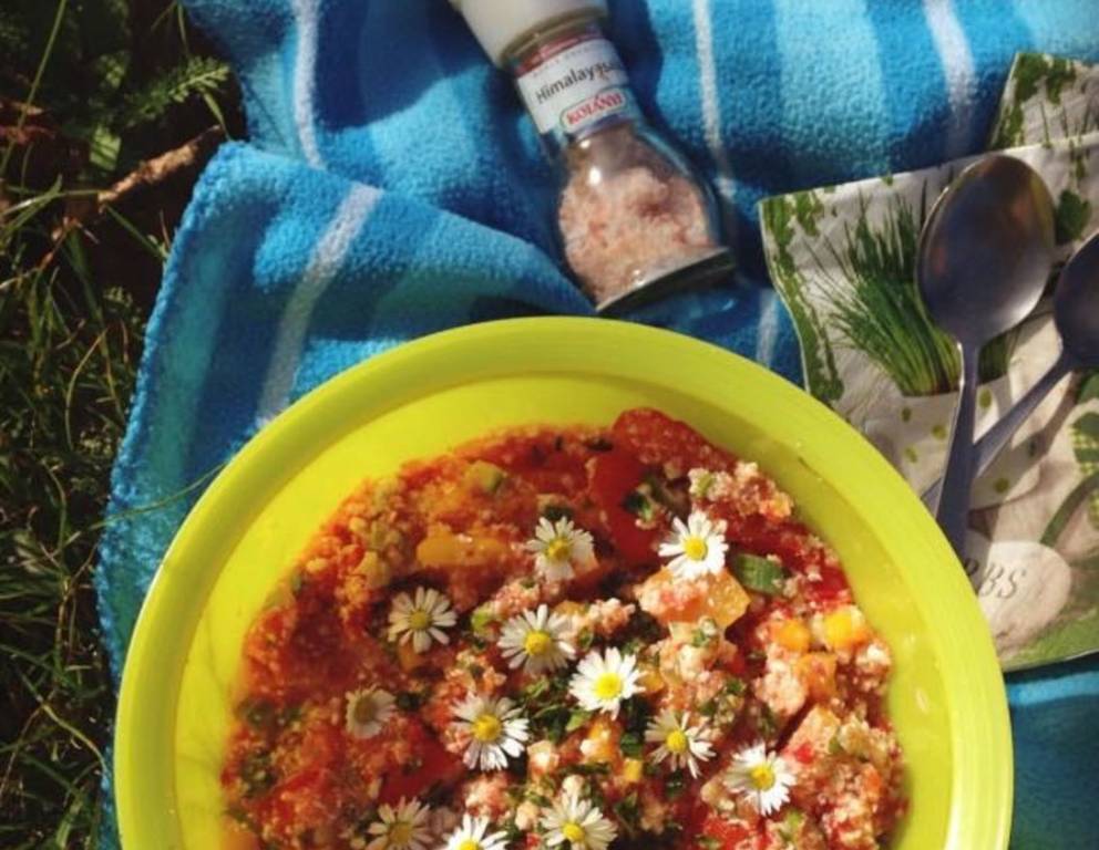 - Das übrige Gemüse in kleine Stücke schneiden und alles in eine Schüssel geben und gut durchmischen. Mit Salz abschmecken und den bunten Karfiol-Salat mit Kräutern, Wildkräutern, Gänseblümchen,... dekorieren.