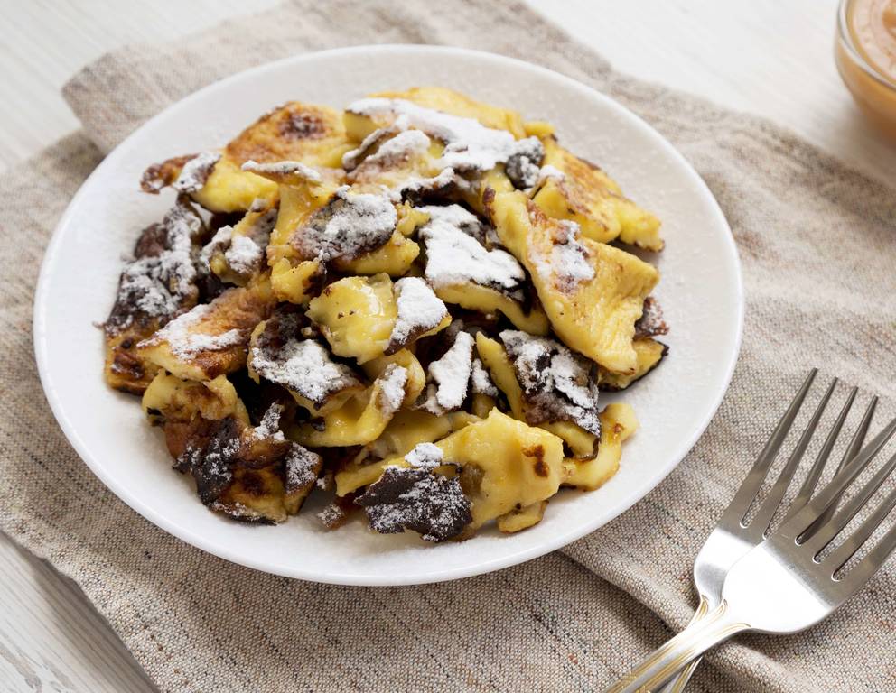 - Milch mit Mehl, Dottern, einer Prise Salz, Zucker sowie Vanillezucker verrühren und 10-15 Minuten quellen lassen. Eiklar mit etwas Zucker steif schlagen und locker unter die Grundmasse rühren. Butter in einer Pfanne nicht zu heiß werden lassen. Teig eingießen und, sobald die Masse am Boden zu bräunen beginnt, kurz mit einer Schmarrenschaufel den Bodensatz aufrühren (dadurch wird der Schmarren etwas fester). Mit Kristallzucker bestreuen und anschließend im Backrohr bei 200 °C ca. 15 Minuten backen. Vor dem Umdrehen zum Karamellisieren etwas anzuckern. Mit zwei Gabeln locker zerreißen und angezuckert servieren.