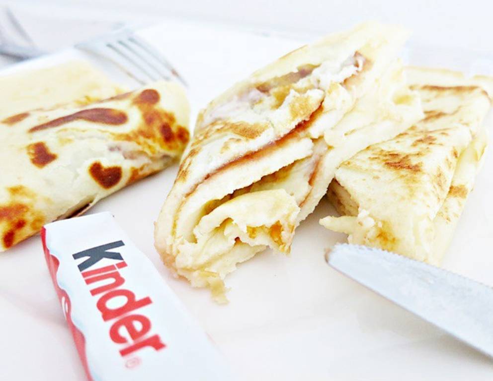- Einen Riegel Schokolade auf die noch warme Palatschinke legen. Seitlich zwei Enden zueinander einschlagen und dann nochmals mittig einschlagen. Die Schokolade ein wenig schmelzen lassen, bevor sie die Kinderschokoladen-Palatschinken servieren.