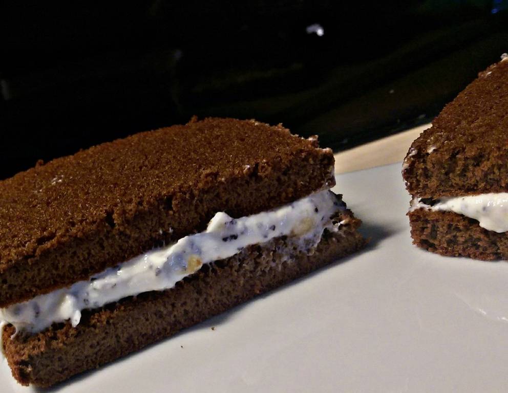 - Den hartgewordenen Rand mit einem Messer wegschneiden und den Bisquit in gleich Große Stücke schneiden (ca. 5x10cm). Die kleinen Schnitten nun mit der Fülle bestreichen und einen Teil des Biskuit drauflegen.
