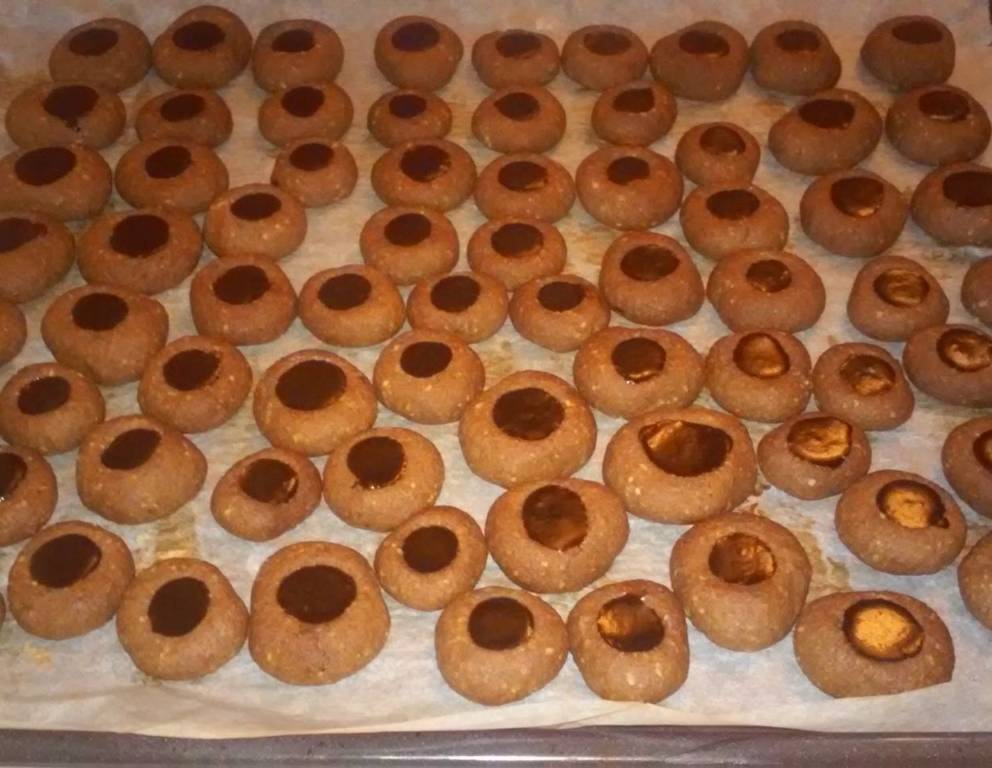 - Diese zu Kugerln rollen, leicht flach drücken und auf ein mit Backpapier ausgelegtes Backpapier setzen. Mit einem bemehlten Kochlöffelstiel jeweils ein kleines Loch in den Teig drücken.