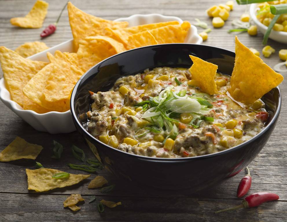 - Pfanne erhitzen, Fleisch ohne Fett anbraten bis die Flüssigkeit verdunstet ist, dann Öl und Knoblauch und Paprikawürfel beifügen und goldbraun rösten. Chili und Gewürze sowie Crème fraîche und den geriebenen Käse unterrühren. Vom Herd nehmen und einen Schuss Wasser dazu mischen. Zuletzt die Maiskörner dazugeben und als Dip mit den Machos servieren.
