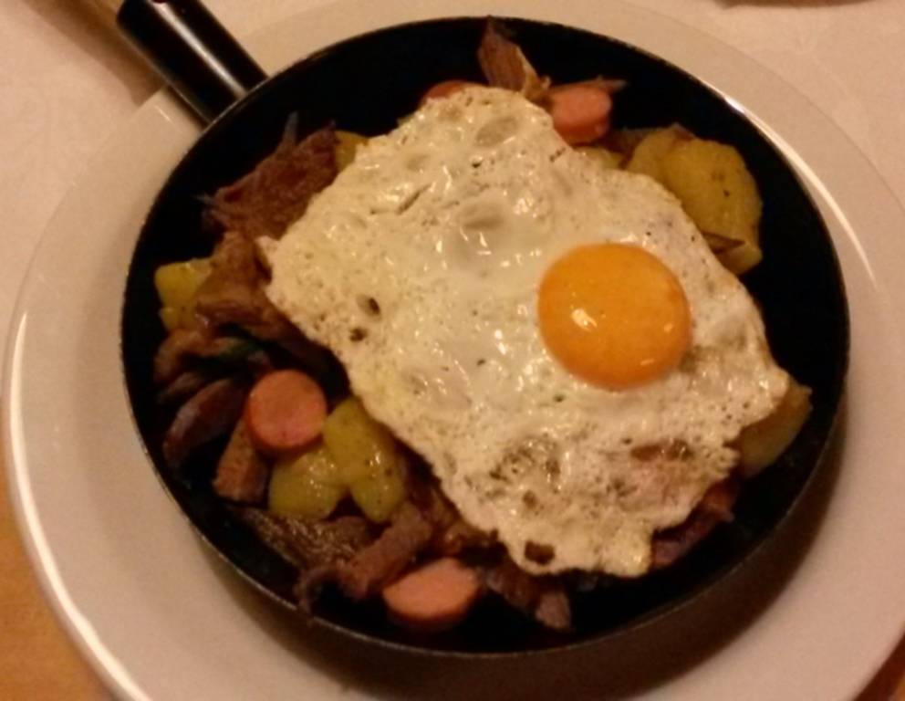 - Butter in einer Pfanne erhitzen, Eier aufschlagen und in der Pfanne Spiegeleier braten. Spiegeleier auf das Tiroler Gröstl legen und in einer Pfanne servieren.
