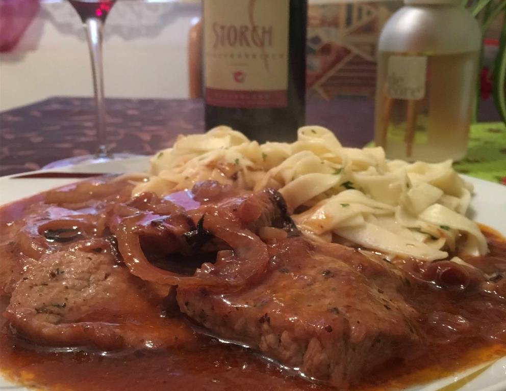 - Soße mit Salz, Pfeffer und Zucker abschmecken. Das Fleisch in die Soße geben und 2-3 Minuten schwach köcheln lassen. Das Rotwein-Schnitzel mit Nudeln und Soße auf Tellern anrichten und servieren.