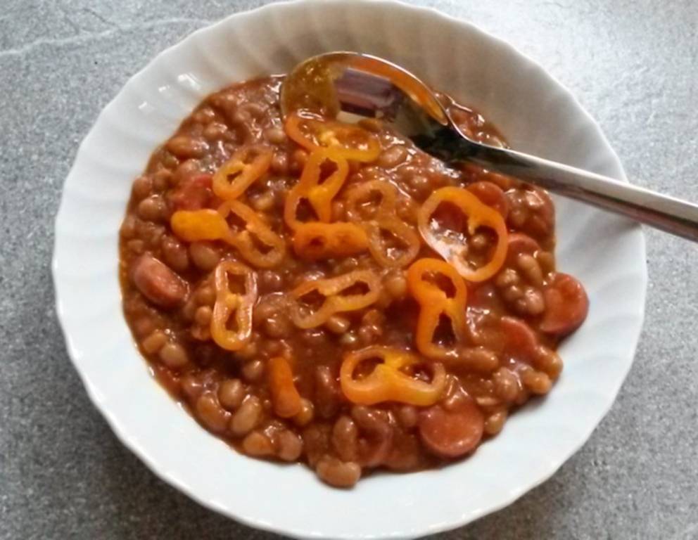 - Tomatenmark, Tomaten, Suppe und die Gewürze zugeben und etwas verkochen lassen. Bohnen aus der Dose hinzufügen. Frankfurter in Ringe schneiden und mit den Chiliwürfeln zum Gulasch geben.