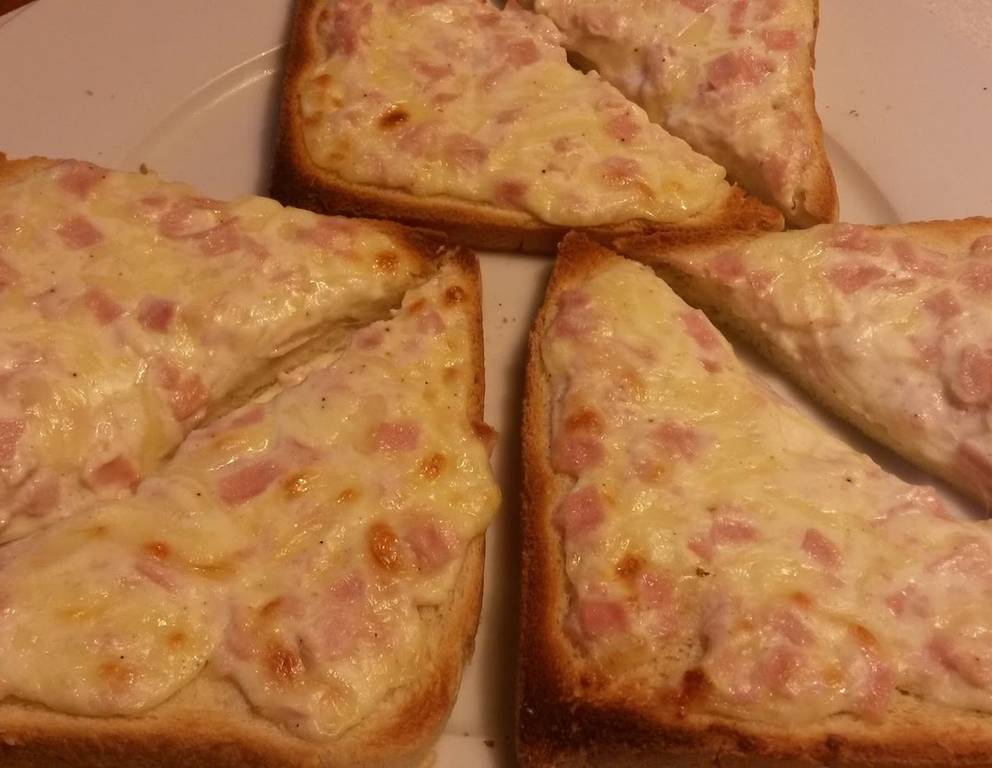 - Die Masse auf Toastbrote streichen und diese diagonal durchschneiden. Die Toastecken im Backofen bei ca. 200 °C etwa 10-12 Minuten überbacken.