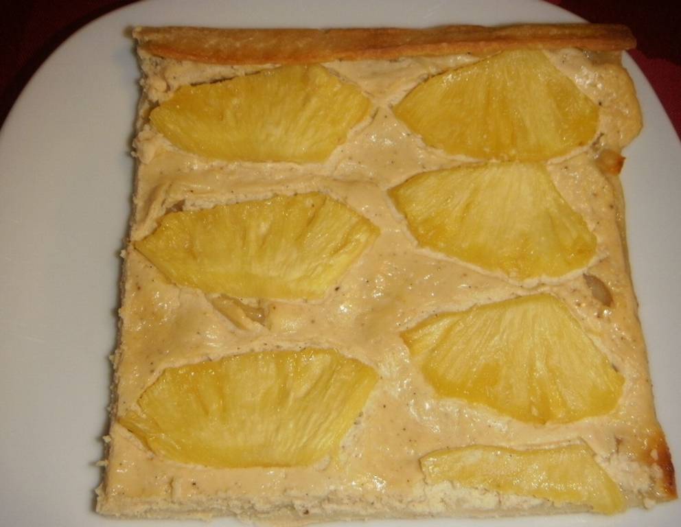 - Den Topfen, Vanillezucker, Zitronenschale, Ei und Zucker gut vermischen und auf dem Flammkuchenteig verteilen. Die Ananasstücke darauf legen und den süßen Topfen-Ananas-Flammkuchen im Rohr ca. 30 Minuten backen.