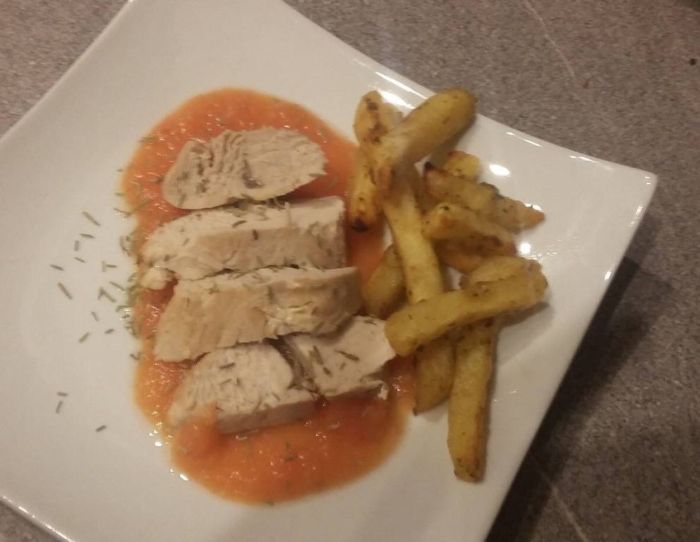 Zur Hendlbrust auf Tomatensauce passen sehr gut mediterrane Pommes oder Erdäpfelpüree.