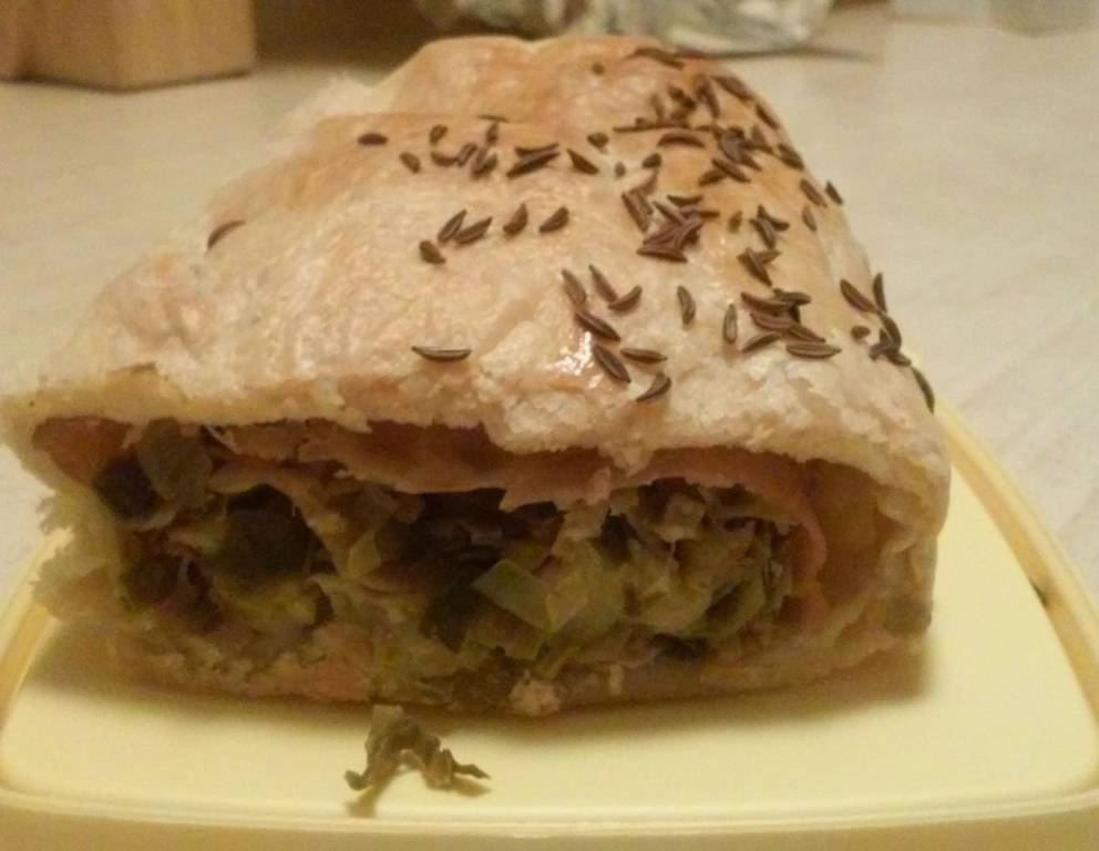 - Den Blätterteig ausrollen, mit Eiklar bestreichen und das Zwiebel-Lauchgemisch darauf verteilen. Für das Zusammenrollen an den Rändern ein wenig Platz lassen.