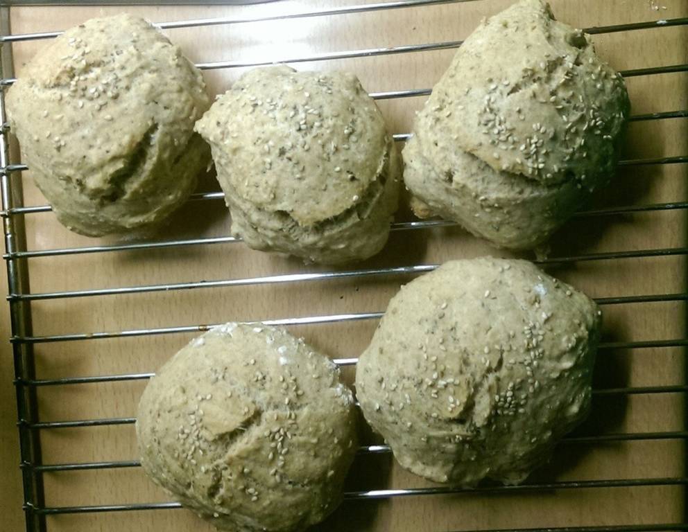 - Für ca. 10 Minuten backen, auf 180° zurückdrehen und für weitere 10-15 Minuten backen. Danach die Sesamweckerl zum Auskühlen auf ein Gitter geben.