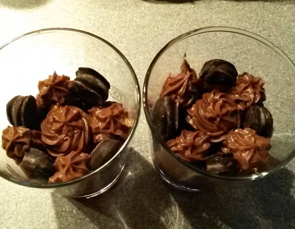 - Etwas Creme in Gläser füllen, Kekse in dieGläser stellen und die restliche Creme in den Gläsern verteilen. Das Schokocreme-Dessert kühl stellen.