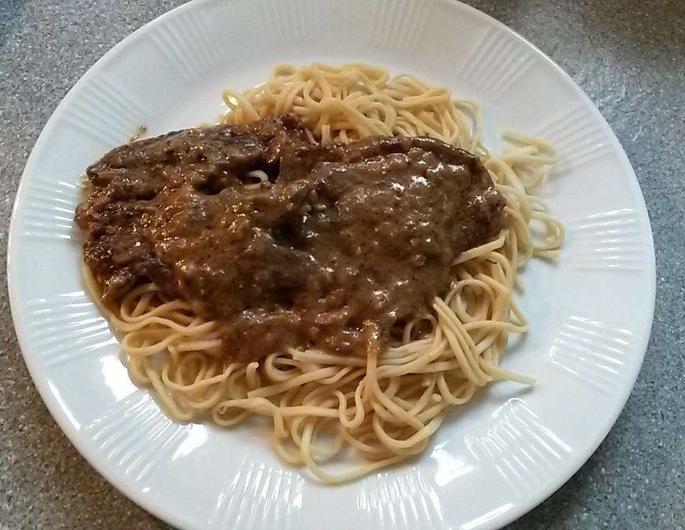 - Gehackte Kapern, Pfeffergewürzmischung und Suppenwürze zugeben und bei geringer Hitze ca. 2 Stunden dünsten lassen. Mit Mehl stauben und mit Schlagobers aufgießen. Das Rindsschnitzel in Kapern-Pfeffernsauce servieren.