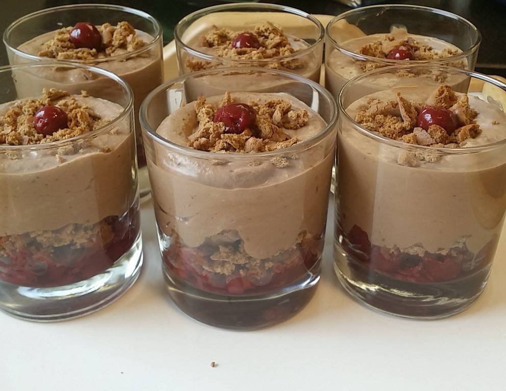 - Die Kirschen abseihen und mit dem Kirschwasser über Nacht abgedeckt ziehen lassen, dann zum Kühlen in den Kühlschrank geben. Nun die Creme schichtweise in ein Glas oder in eine Dessertschale geben.