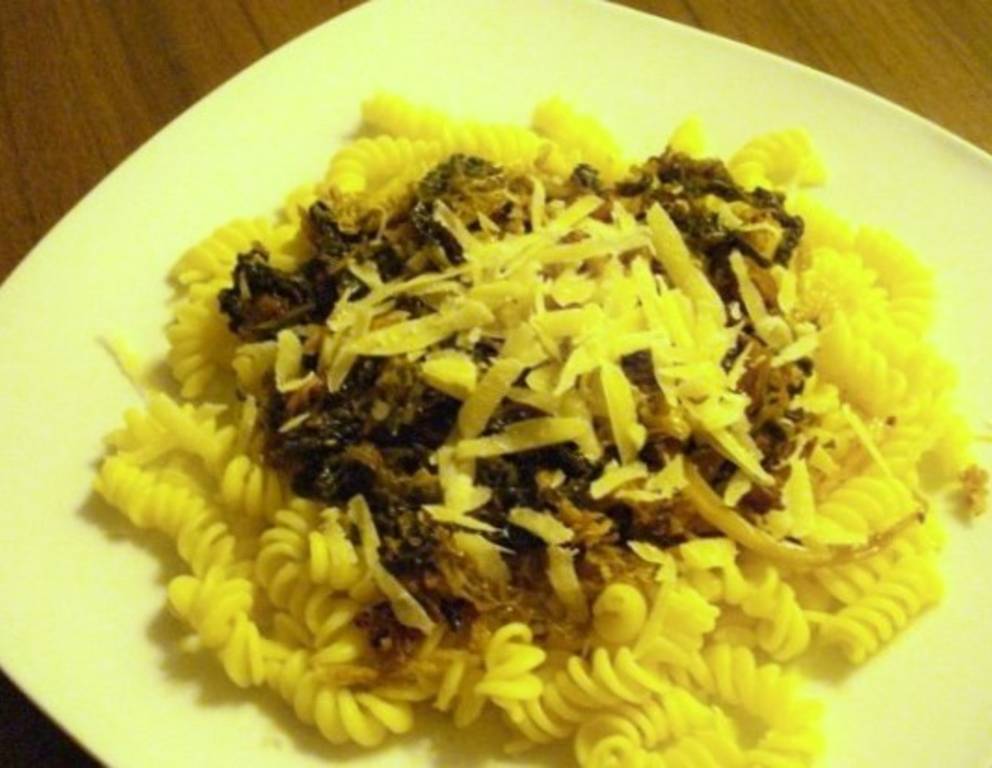 - Nudeln in Salzwasser al dente kochen und abseihen. Nudeln anrichten, darauf das Gemüse verteilen und die Nudeln mit Kohlgemüse mit geraspeltem Parmesan dekorieren.