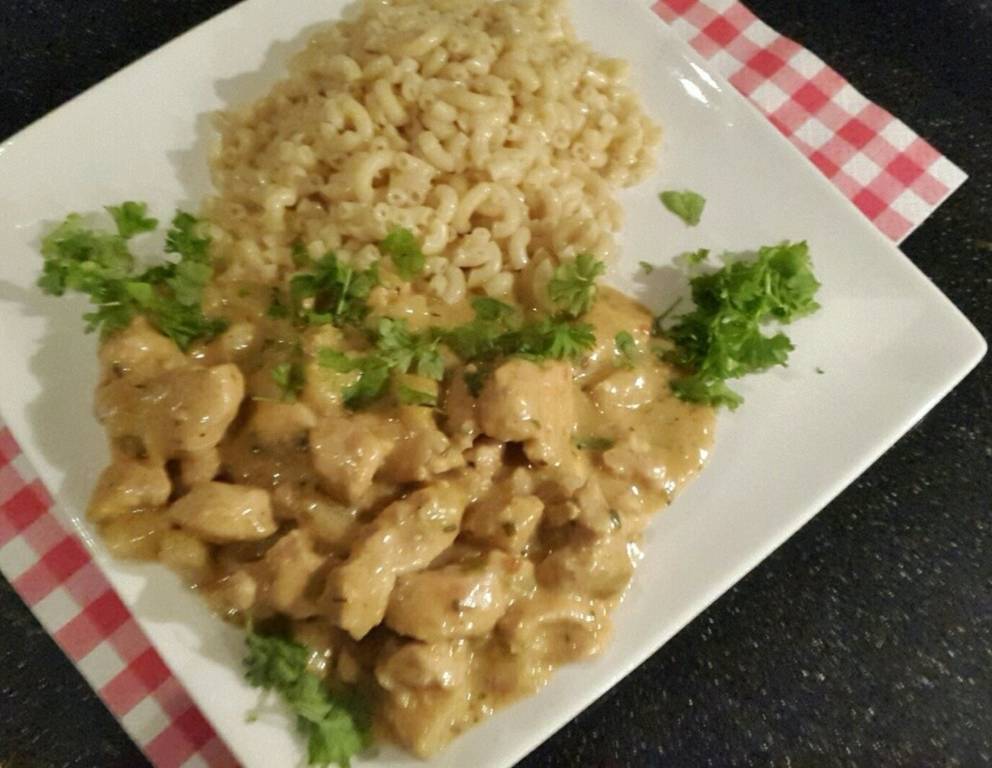 Zum exotischen Geflügelgeschnetzelten reichen Sie am besten Pasta oder Reis.
