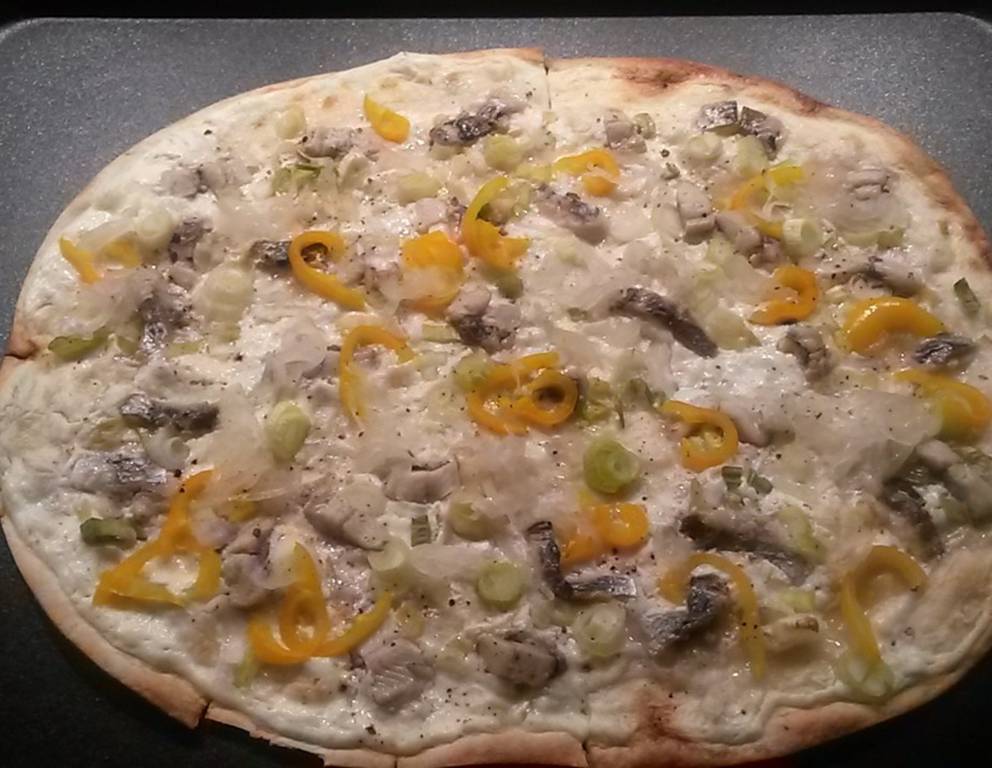 Statt Hering kann man auch einen anderen Fisch, wie zum Beispiel Lachs, für den Flammkuchen verwenden.