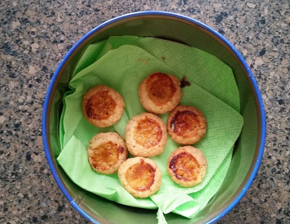 - Der Rand der Husarenkrafperl wird mit Eiklar bestrichen, optional mit gehackten Nüssen oder Mandelplättchen noch verziert und die Vertiefung mit Marmelade gefüllt.