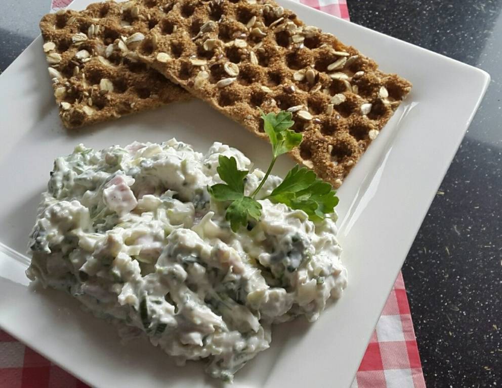- Abschmecken und evtl. noch nachwürzen. Die gewürzte Mayonnaise zum Lauch, den Eiern und Schinkenwürfeln geben und gut vermengen.