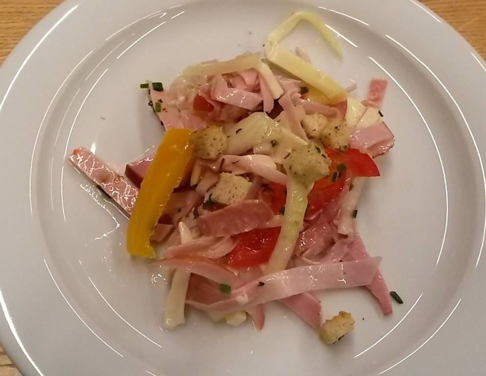 Den Käse-Wurst-Salat kann man beliebig variieren. Er eignet sich auch sehr gut zum Verwerten von Restln. Dazu schmeckt frisches Gebäck oder Brot
