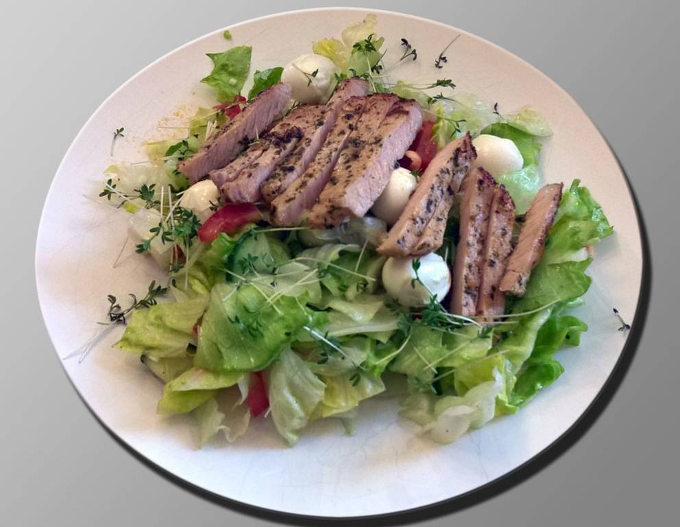 - Auf drei Teller aufteilen und den Salat mit Baby-Mozzarella und etwas Gartenkresse belegen.  Das Fleisch mit Olivenöl, Kräutern und Salz marinieren und in der Pfanne braten bzw. auf dem Grill grillen.