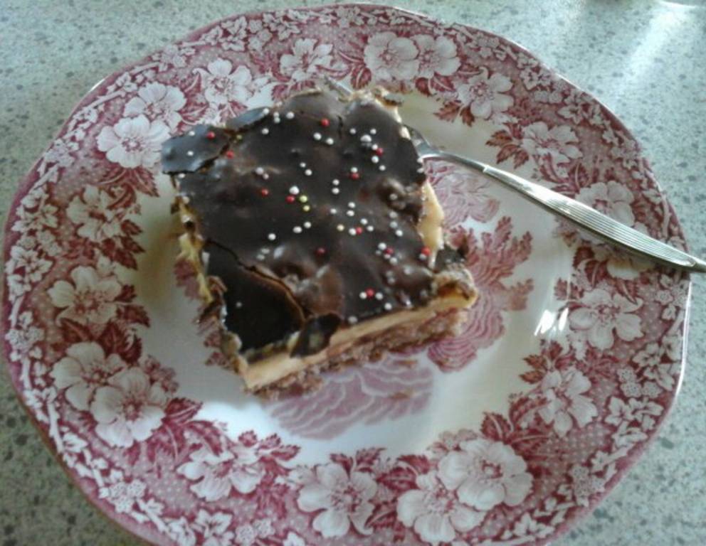 - Aus Kochschokolade und Kokosfett eine Glasur zubereiten, auf dem Kuchen verteilen und mit Zuckerstreuseln garnieren. Die Bananenschnite einige Stunden, am besten über Nacht, im Kühlschrank fest werden lassen.