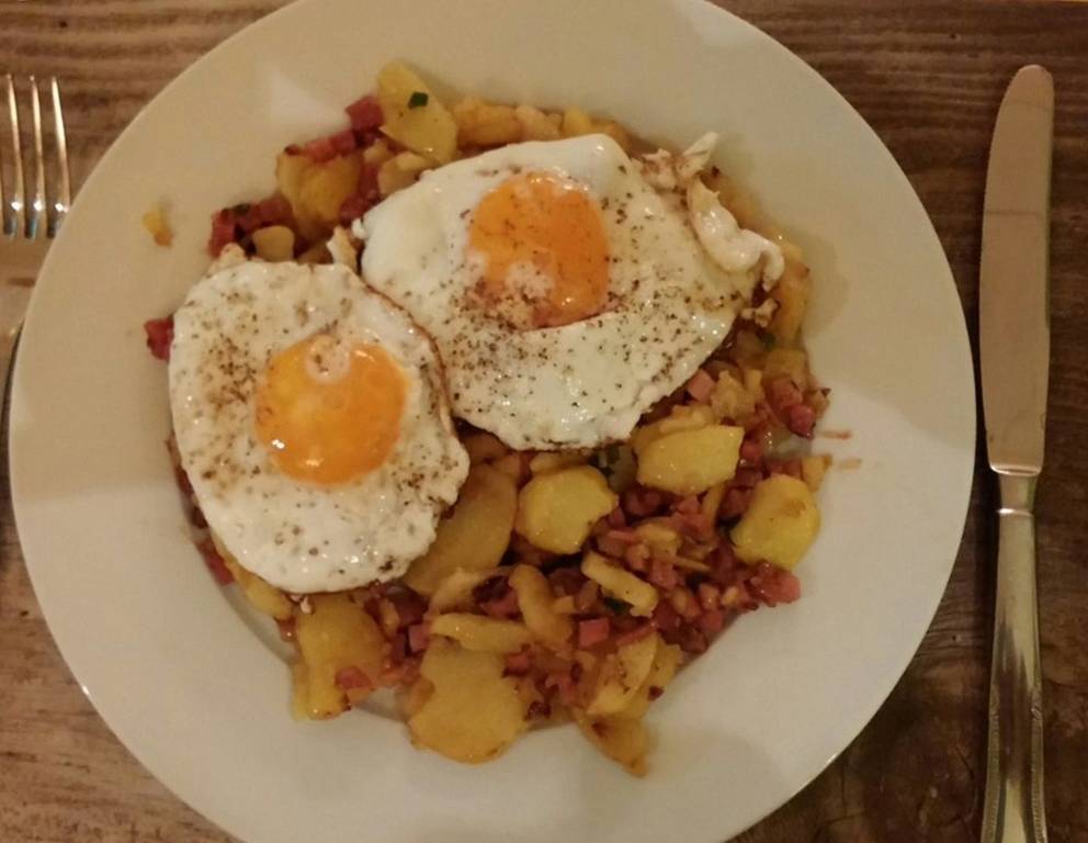 Zum Berner Rösti eignet sich als Beilage ein frischer Salat. Statt Spiegelei, kann man auch so 2 Eier hineinschlagen und mit dem Rösti vermengen, bis es gestockt ist.