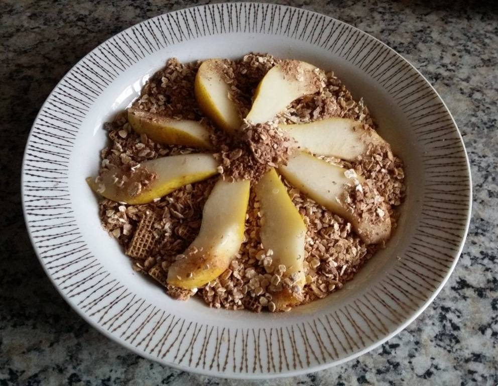 Für das Haferflocken-Müsli mit Birnen wurden Gitter-Vollkorn-Cornflakes und eine Haferflockenmischung verwendet. Für Birnenliebhaber das ideale Frühstück.