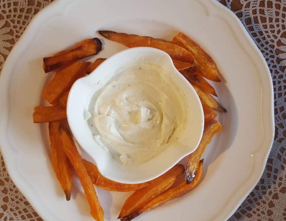 - Den Frischkäsedip mit einem gepressten Knoblauch und Kräutersalz anrühren.