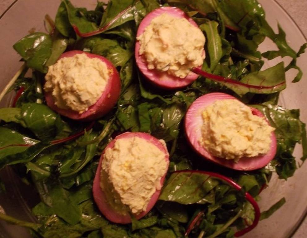 Besonders schön sieht es aus, wenn Sie rotstieligen Mangold für die roten Eier auf Mangold-Spinat-Salat verwenden.