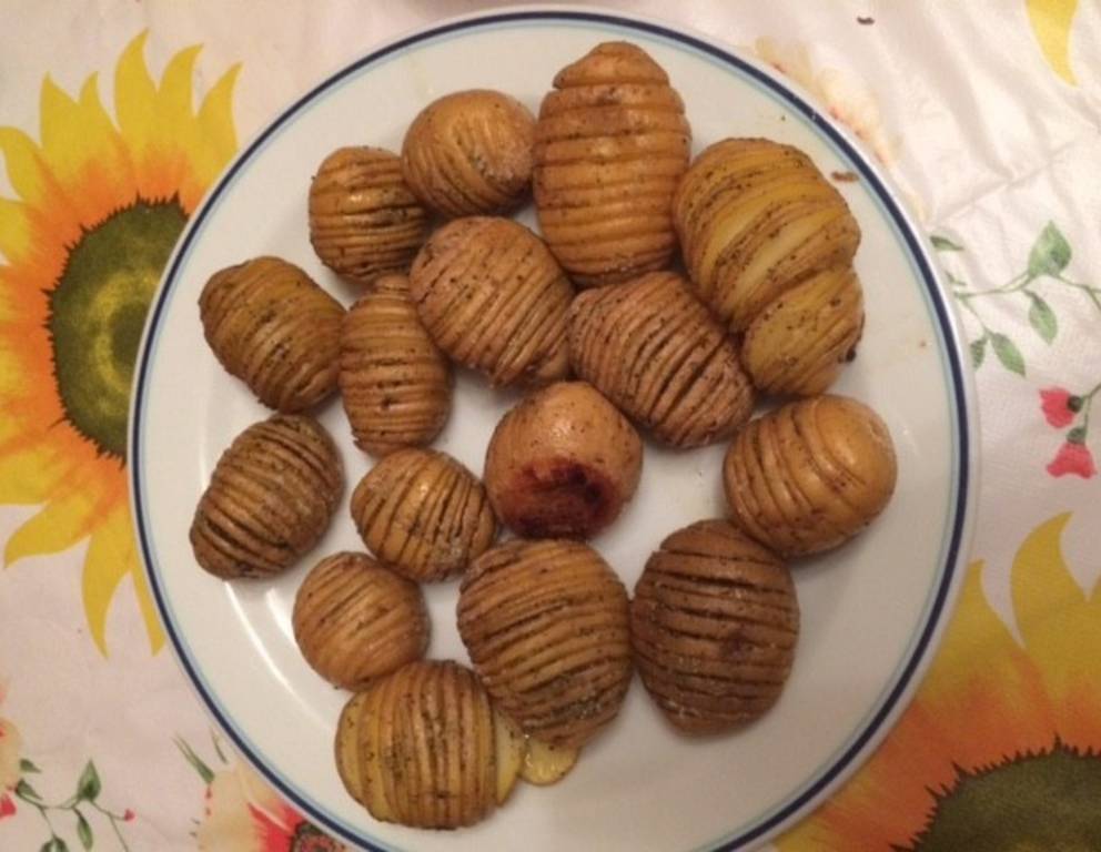 - Anschließend noch Salz und Pfeffer darüber streuen und in die Spalten streichen. Die gewürzten Erdäpfel bei 180° ca. 30 Minuten braten. Die Fächererdäpfel aus dem Backrohr servieren.