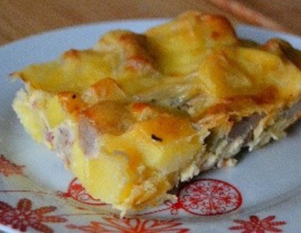- Die Schwarzwurzeln, Kartoffeln und den gewürfelten Speck in einer Auflaufform verteilen. Die Obers-Ei-Sauce darübergießen und mit Gouda bedecken.