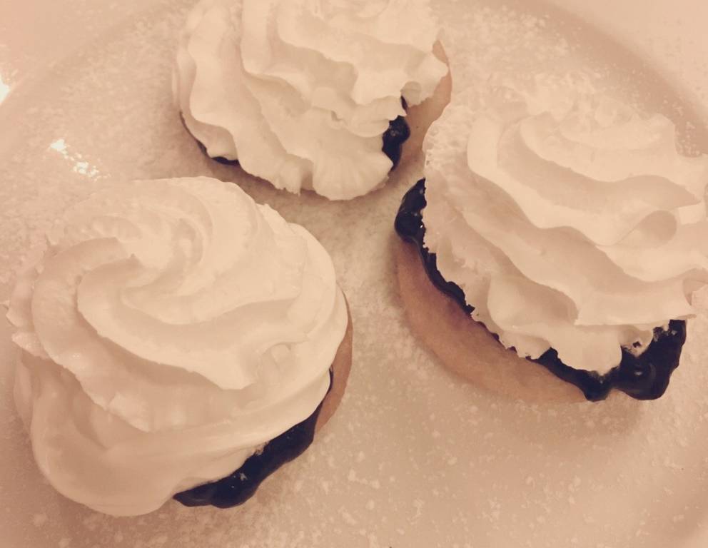 - Beide Seiten anbraten lassen. Anschließend jeweils einen großen Esslöffel Heidelbeermarmelade auf die Blinis geben. Das geschlagene Schlagobers in einen Spritzsack füllen und auf die Blinis kreisförmig spritzen.