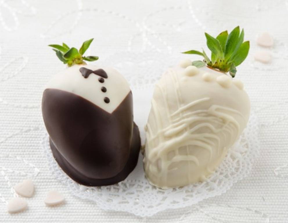 - Für den Erdbeer-Bräutigam die dunkle Glasur im Wasserbad schmelzen. Die Erdbeeren von jeder Seite schräg eintunken, sodass sich ein Ausschnitt wie bei einem Anzug ergibt. Dunkle Glasur in ein Stanitzel füllen und je drei Knöpfe sowie eine Fliege aufspritzen.