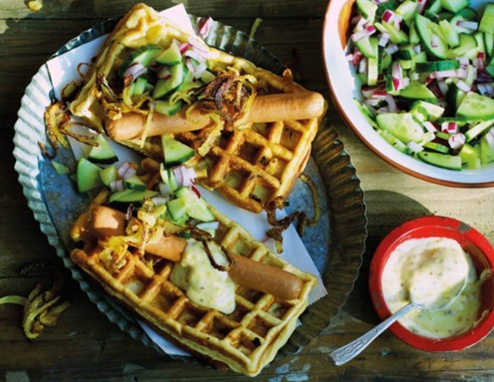 - Die Würstchen in heißem Wasser erhitzen. Die Waffeln auf Tellern anrichten und jeweils ein Würstchen darauflegen. Mit Gurkenrelish sowie Röstzwiebeln belegen. Mayonnaise und Ketchup nach Belieben über die Hot-Dog-Waffeln geben.