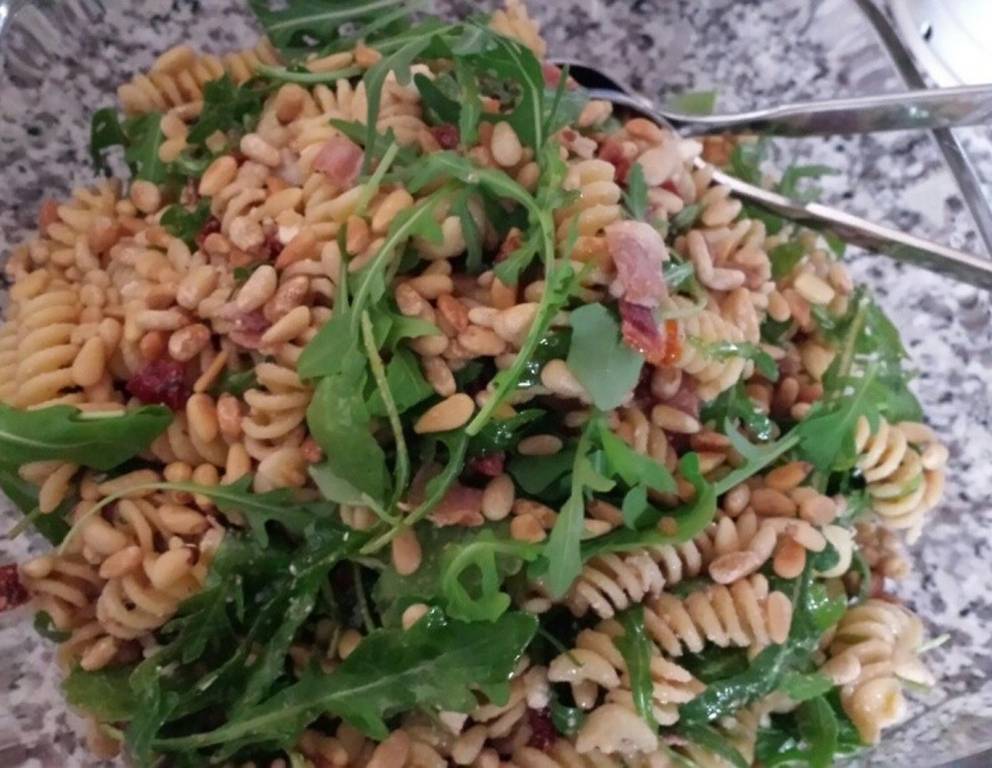 Der Nudelsalat kann für Gäste schon am Vortag zubereitet werden. Dabei sollte man unbedingt beachten, das Dressing und den Rucola erst kurz vor dem Servieren dazu zu geben.