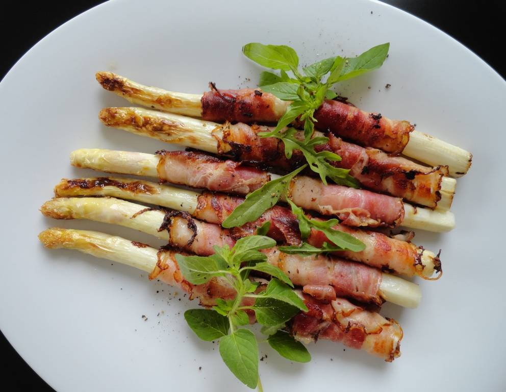 - Pro Spieß ein Blatt Prosciutto um die Spargelstücke (5 Stück pro Spieß) weben. Nun einen Spieß durch die Spargel-Prosciutto-Reihe stechen und auf den Grill legen.