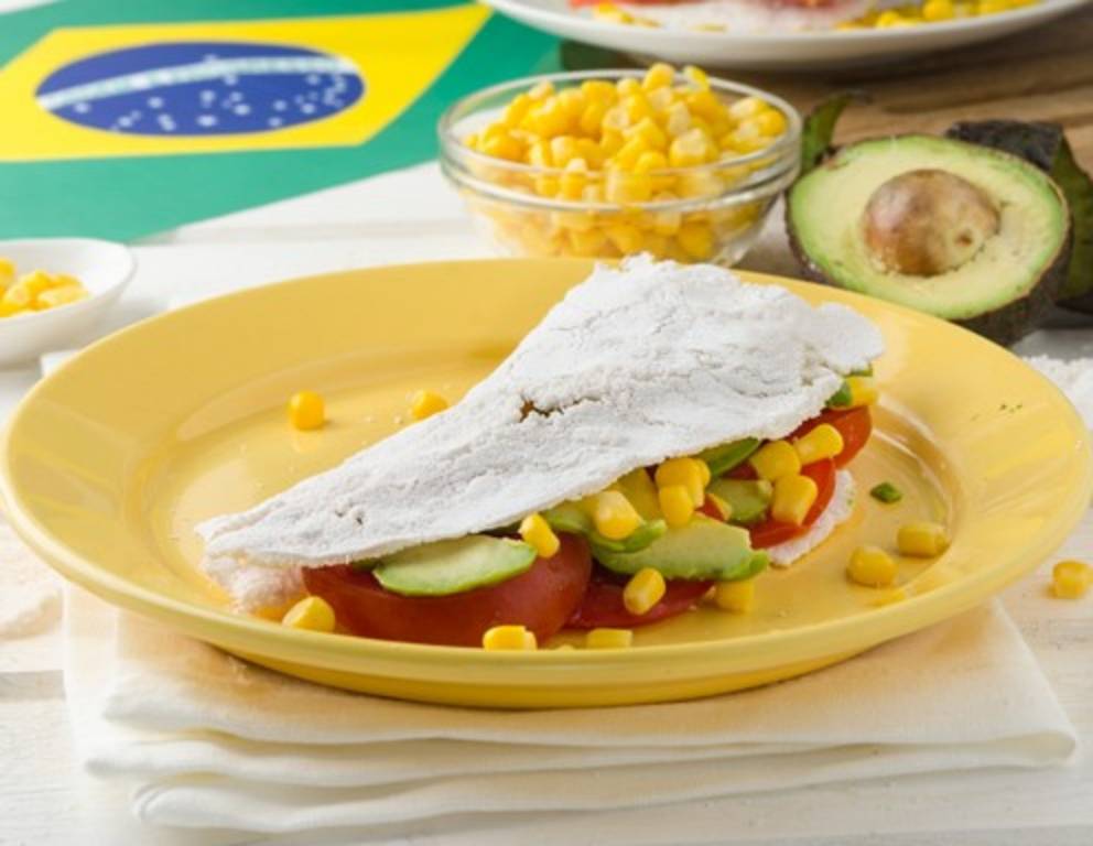 - Die Tapioka-Crêpes mit Avocados, Mais und Tomaten füllen.