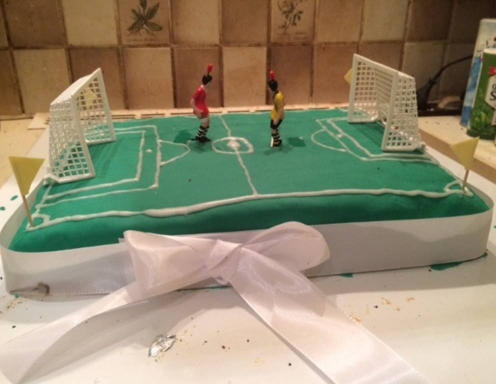 Wenn man um die Torte noch ein ca 3 cm hohes Band legt, verleiht man der Fußballfeld Torte noch ein wenig Pepp.