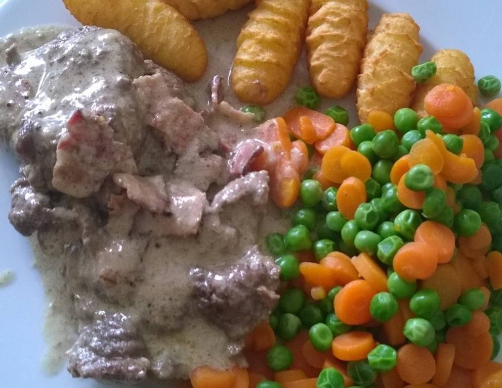 - Die fertigen Schnitzeln aus der Pfanne geben und die Speckstreifen anbraten. Danach das Fleisch wieder in die Pfanne geben und mit einem Becher Schlagobers aufgießen.