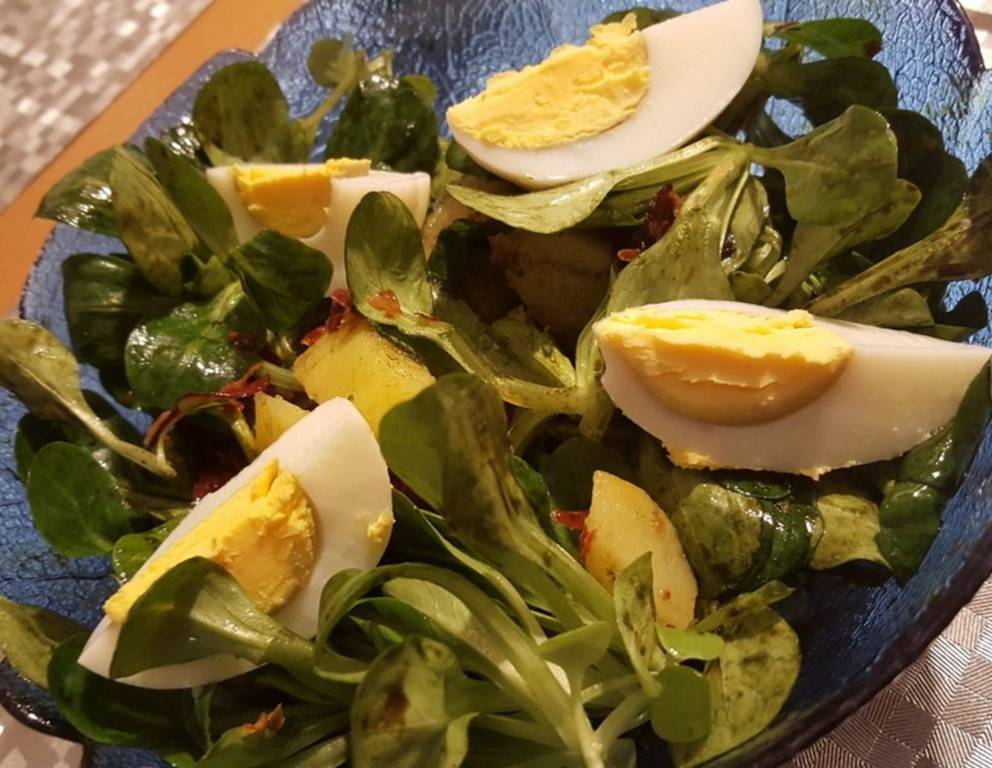 - Kartoffeln, Speck und Eier in einer Schüssel mit dem Salat vermengen.