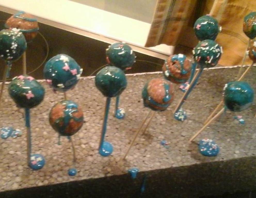 - Nun die Cake Pops aus dem Tiefkühler holen und verzieren. Dazu das Holzstäbchen einmal kurz in die Glasur tunken und in die Kugeln stecken. Wenn dies mit allen gemacht wurde, damit beginnen, die Schnitten-Cake Pops zu glasieren.