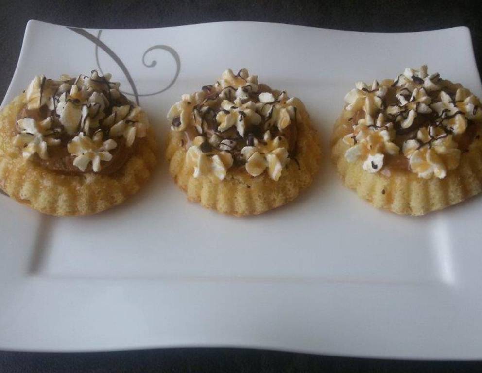 - Die Schokomousse in einen Spritzbeutel füllen und  eine Schicht Mousse auf die Törtchen spritzen. Danach einige Tupfen Schlagobers darauf und mit der abgekühlten Karamellsoße großzügig und nach Geschmack beträufeln.