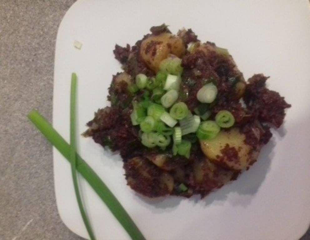- Die Blutwurst aufschneiden, schälen und in grobe Stücke schneiden. In einer Pfanne die Butter erhitzen und die Zwiebelringe darin etwas anbraten. Nun die Kartoffelstücke zu den Zwiebel geben und etwas Olivenöl dazugeben. Mit Salz und Kümmel würzen, die restlichen Frühlingszwiebel ebenfalls kleinschneiden und über das Blunzengröstl streuen.