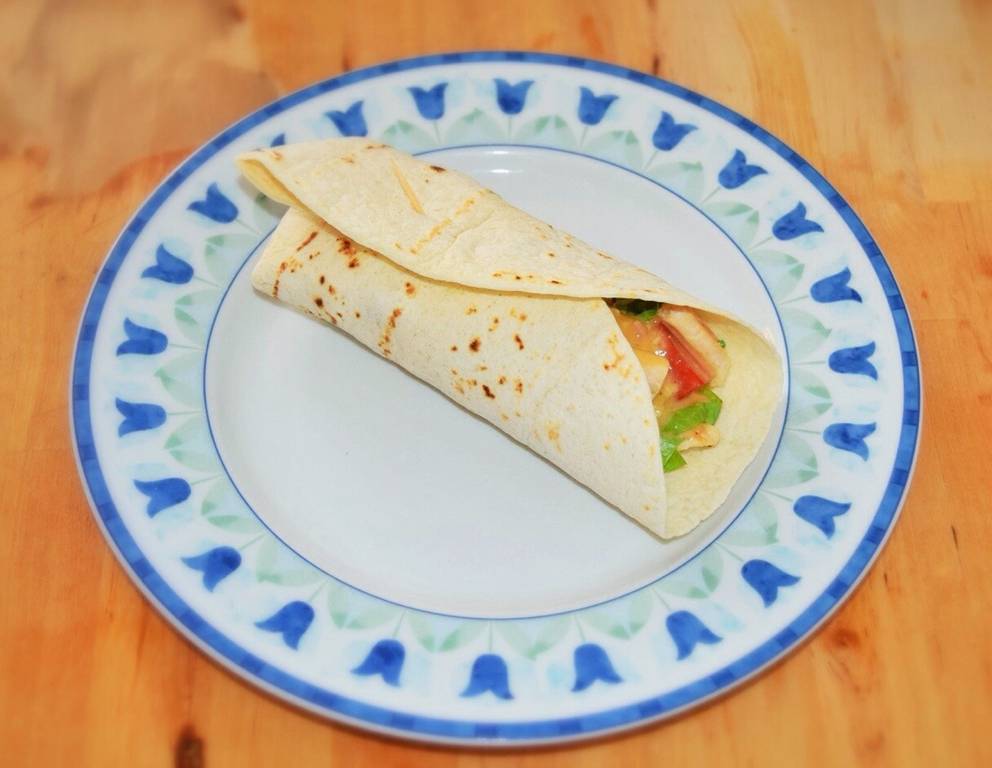 - Salat, Tomaten, Parmesan, Speckwürfeln und Hühnerstreifen in den Wrap eingeben, den Wrap schließen (falls notwendig mit einem Zahnstocher fest machen) und servieren.